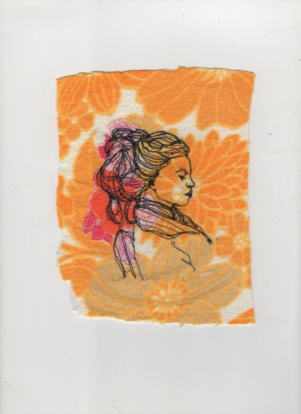 My process involves lining a nice piece of fabric with interfacing, to make it more stable, and then sewing appliqué pieces from another piece of fabric, usually flowers on to the fabric for added colour and interest. Once that was done I used a pencil sketch, either of my own drawing or of a photo onto thin tracing paper and then with a freehand machine foot and the right stitch setting would 'draw' around the outline of the sketch. I'd then take the paper off, ripping it carefully to remove it from the stitches, and would carry on filling in the details and the rest of the drawing so that most of it really is freehand.